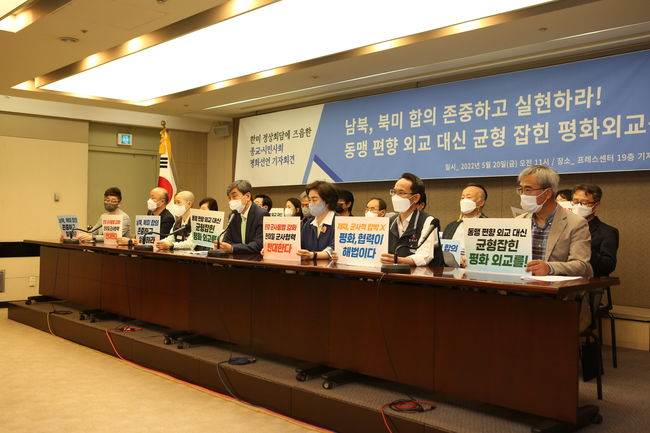 한미정상회담을 앞두고 종교 · 시민단체들은 20일 서울 중구 한국프레스센터에서 `한미 정상회담에 즈음한 종교 · 시민사회 평화선언 기자회견`을 진행했다.기자회견에서 이 단체들은 새 정부에 균형 잡힌 평화 외교 정책 실현을 촉구하면서 이번 한미정상회담에서 대북 억제와 인도·태평양 전략 등 의제를 다루는 만큼 외교적으로 중요한 시기라는 점을 강조했다.