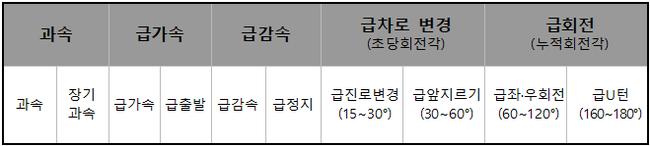 유형별로는 급가속이 28.44건(무사고 운전자의 1.98배)으로 가장 높았으며, 급감속 12.34건(무사고 운전자의 2.1배), 급진로변경 5.1건(무사고 운전자의 2.08배) 순이었다.