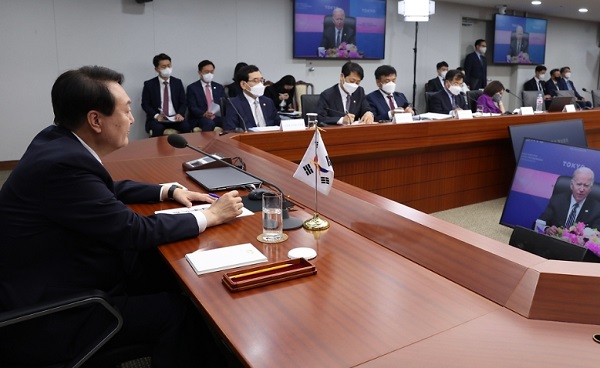 ▲ 윤석열 대통령이 23일 서울 용산구 대통령실 청사에서 인도태평양 경제프레임워크(IPEF) 고위급 화상회의에 참석하고 있다. (사진=제20대 대통령실)러시아-우크라이나 사태 등을 통해 불거진 글로벌 자원수급 불확실성은 에너지 신산업 등을 창출해 선제적으로 대응한다. 에너지믹스를 합리적으로 조정하고 에너지·산업·수송부문 NDC(국가 온실가스 감축 목표) 달성 방안을 수정한다는 구상이다.