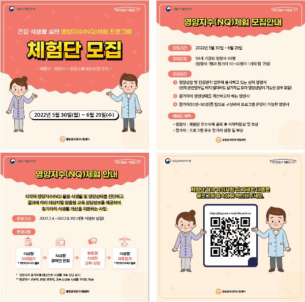 아울러 체험 프로그램에 참가한 영양사와 참가자를 대상으로 누리소통망(SNS) 이벤트도 진행하며, 체험단의 활동과 우수사례는 식약처 마이나슈 TV(유튜브), 인스타그램, 블로그 등에 소개하고 식약처장상도 수여할 예정이다.
