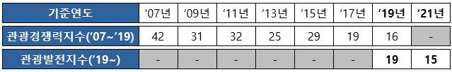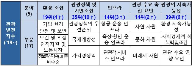 우리나라는 종합 15위이며, 2019년 19위에서 4계단 상승했는데, 순위 변화가 크지 않은 상위 30위 이내 국가 중에서는 최대폭의 상승이다. 5대 분야 모두 순위가 상승했으며, 이 가운데‘관광정책 및 기반 조성’이 10계단 상승해 가장 큰 폭으로 개선됐다. 또한 ‘인프라’, ‘관광 수요 촉진 요인’ 분야는 각각 14위로 가장 높은 순위를 기록했다.