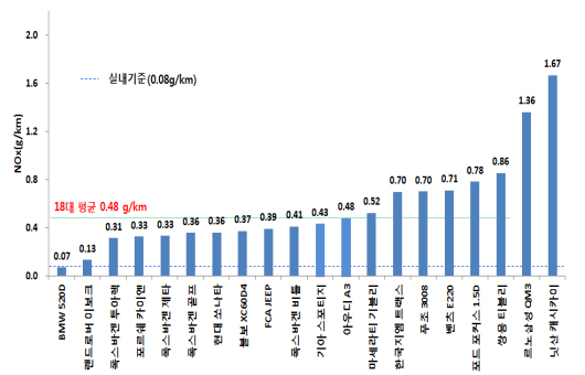 실외 도로주행시험에서 질소산화물 배출량은 캐시카이 차량이 실내인증기준(0.08g/km)의 20.8배, 르노삼성(주) QM3 차량이 실내인증기준(0.08g/km)의 17.0배로 높게 나타났다.