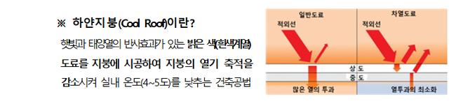 하얀지붕 : 햇빛과 태양열의 반사효과가 있는 밝은 색(흰색계열) 도료를 지붕에 시공하여 지붕의 열기 축적을 감소시켜 실내 온도(4~5도)를 낮추는 건축공법