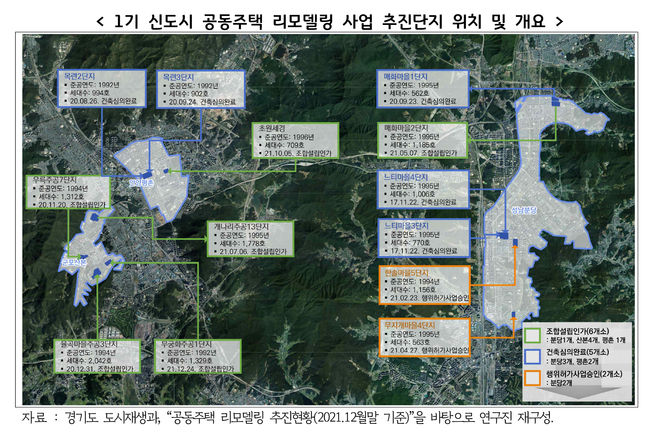 경기도는 1980년대 후반부터 1시 신도시 사업이 추진돼 1991~1993년 분당, 평촌, 산본, 일산, 중동 등 5곳이 조성됐다. 이들 신도시는 준공 30년이 지나면서 건축물 노후화 등을 겪고 있는데, 특히 새 정부가 ‘재건축․리모델링 포함 1기 신도시 재탄생을 위한 종합 재정비 발전방안 마련’을 경기도 지역공약을 제시함에 따라 주목받고 있다.