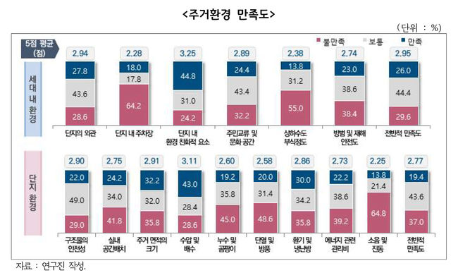 현 거주 상태 관련 조사에서 신도시 주민의 19.4%만이 전반적인 세대 내 환경에 만족했다. 가장 큰 불만족 요소는 주차장(64.2%)과 상하수도 부식(55.0%)을 지목했다. 신도시 주민의 단지 만족도 26.0%에 머물렀는데, 주요 원인은 소음 및 진동(64.8%), 단열 및 방풍(48.6%), 누수 및 곰팡이(45.0%)였다.