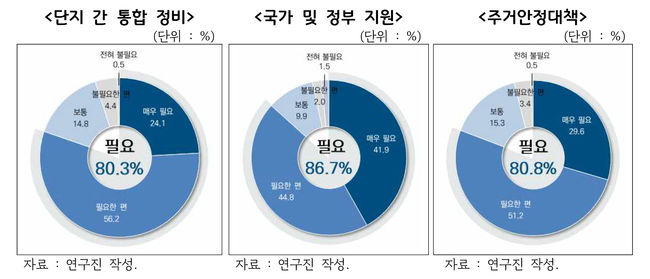재건축 시 용적률로는 300% 이하가 47.8%, 층수는 21~30층이 56.2%로 가장 많이 나왔다. 단지 간 통합 정비(80.3%), 국가 및 정부의 지원(86.7%), 순환형 개발과 재건축 시기 조정 등 주거안정대책(80.8%)도 상당수 동의하며 정책 수요가 큰 것으로 나타났다.