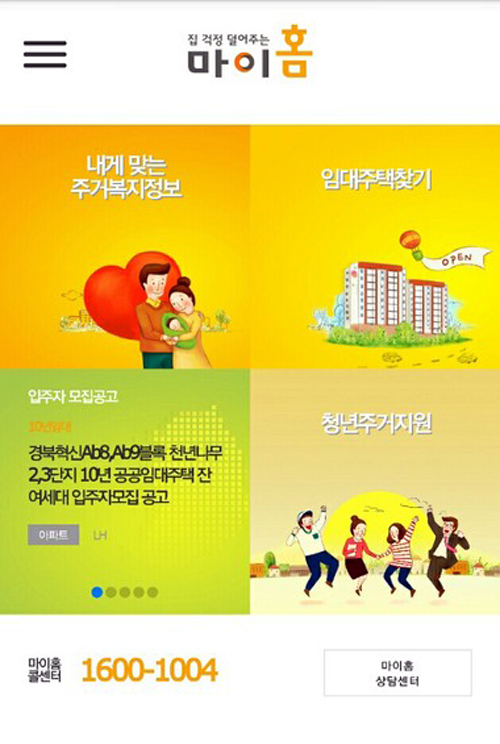 이는 정부의 각종 주거지원 서비스를 통합 상담·지원하기 위해 지난해 12월부터 구축·운영중인 '마이홈' 서비스를 오프라인 상담센터, 콜센터(1600-1004) 및 온라인 포털(www.myhome.go.kr)에 이어 모바일 서비스까지 확대하는 것이다.