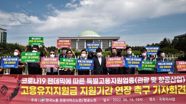 한국노총 관광 · 서비스노동조합연맹과 항공산업노동조합연맹은 14일 서울 여의도 국회 앞에서 `특별고용지원업종 고용유지 지원금 지원기간 연장` 기자회견을 열었다.이들은 “특별고용지원업종에 대한 고용유지지원금 지원은 대량해고를 줄이고 고용안정에 크게 기여한 것은 사실이나, 지난 2년 2개월 동안 발생한 영업피해는 여전히 회복 불가능한 상태”라고 설명했다.
