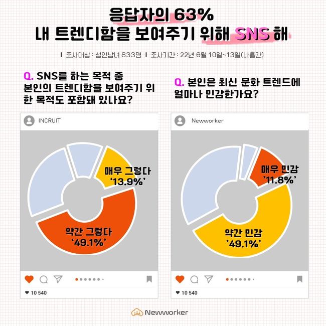 휴먼클라우드 플랫폼 뉴워커(대표 서미영)는 현대인의 최신 트렌드 민감 정도와 함께 트렌드와 SNS의 상관관계를 알아보기 위해 성인남녀 833명을 대상으로 설문조사를 진행했다.