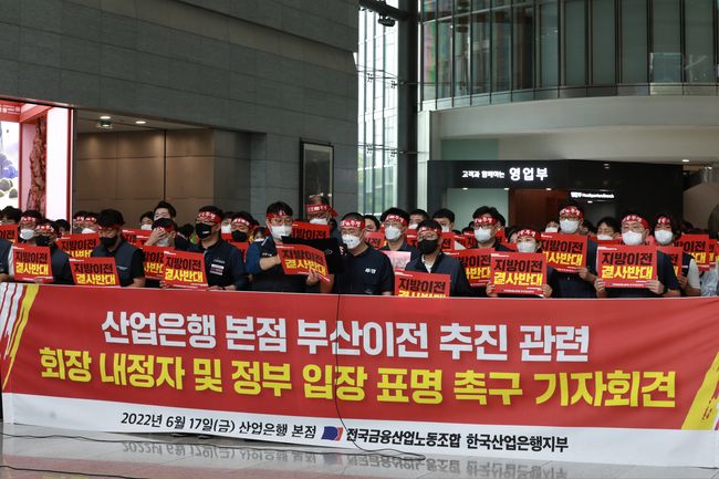 KDB산업은행 노동조합이 17일 서울 여의도 산은 본점 로비에서 `산업은행 본점 부산이전 추진 관련 회장 내정자 및 정부 입장 표명 촉구 기자회견`을 개최하고 본점의 부산 이전 방침에 대해 강력하게 반대하고 나섰다. 산은 노조 측은 “대통령을 비롯한 행정부가 지금이라도 회장을 통한 ‘산업은행 이전 압박’을 멈춰야 한다”며 “본점 부산 이전에 대한 구체적인 실효성 검토를 선시행한 후 이를 근거로 한 입법기관 국회의 판단을 존중하라”고 밝혔다.