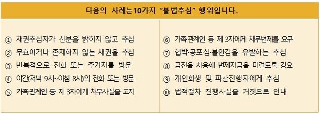 서울시는 채권추심자는 채권추심과 관련하여 채무자 또는 관계인을 폭행·협박등 위력을 행사하는 행위, 반복적 또는 야간(오후 9시 이후부터 오전 8시까지)전화 또는 방문(채무자·가족 및관계인)하는 행위, 채무자 외의 사람(보증인 포함)등 제3자에게 채무변제를 요구하는 행위 등은 모두 불법추심 행위에 포함되므로 휴대전화 녹화․녹음․증인 등 관련 증빙자료를 최대한 확보하여 적극적인 신고가 필요하다고 말했다.