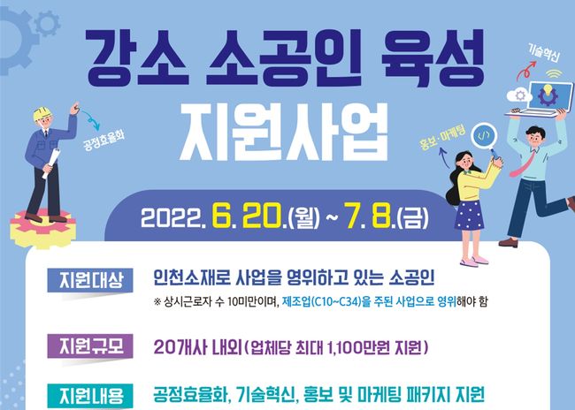 인천광역시는 2022년 강소 소공인 육성 사업의 지원 대상자를 6월 20일부터 7월 8일까지 공개 모집한다고 19일 밝혔다. 선도적 소공인 기업을 육성해 산업생태계를 강화하고 지역 경제를 활성화 한다는 구상이다.
