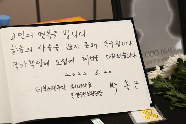 박 원내대표는 발달 · 중증장애인 참사 분향소 방문록에 `국가책임제 도입에 최선을 다 하겠다`고 기록했다.