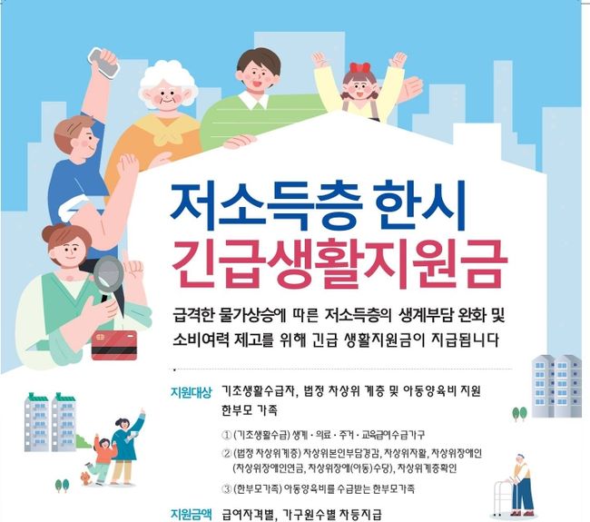저소득층 생계부담을 완화하고 소비여력을 높이고자 `저소득층 한시 긴급생활지원금`을 지급한다고 밝혔다.