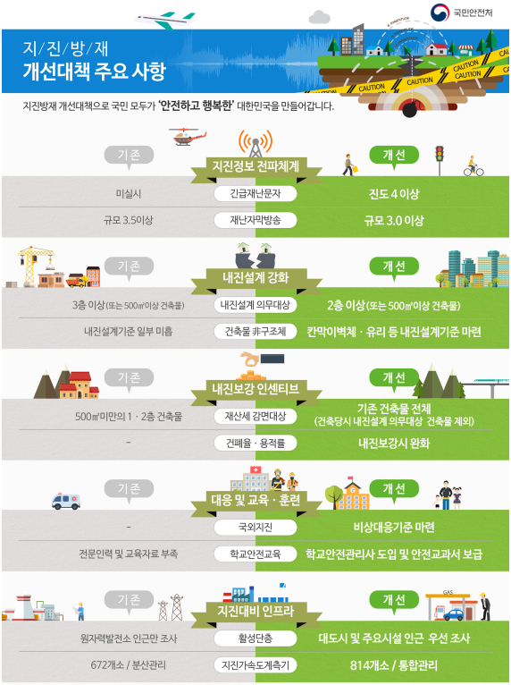 정부는 27일 정부서울청사에서 황교안 국무총리 주재로 열린 제9차 국민안전 민관합동회의에서 이 같은 내용을 포함한 ‘지진방재 개선대책’을 확정했다.