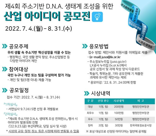 행정안전부가 주소기반 데이터․네트워트․인공지능 생태계 조성할 아이디어를 찾는다.행정안전부는 주소정보를 기반으로 국민의 생활안전 편의를 높이고 관련 산업을 활성화하기 위해 한국국토정보공사와 7월 4일부터 8월 31일까지 ‘주소기반 데이터․네트워크․인공지능(D.N.A.) 생태계 조성을 위한 산업 아이디어 공모전’을 개최한다고 3일 밝혔다.