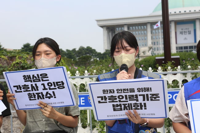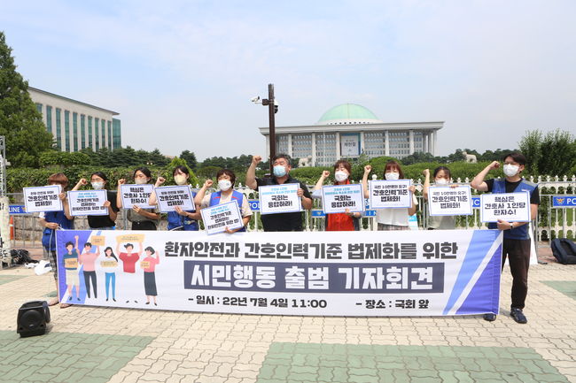 행동하는간호사회 등 28개 단체가 참여해 결성한 시민행동은 기자회견에서 간호사 1인당 담당 환자 수를 제한하는 내용을 골자로 하는 간호인력인권법 제정을 요구했다.시민행동은 "간호인력인권법 핵심은 간호사 1인당 담당 환자 수를 법으로 정하는 것"이라며 "이는 간호인력 부족 문제의 근본적 원인을 해결할 수 있는 방안으로 간호법에는 포함돼 있지 않은 내용"이라고 주장했다.