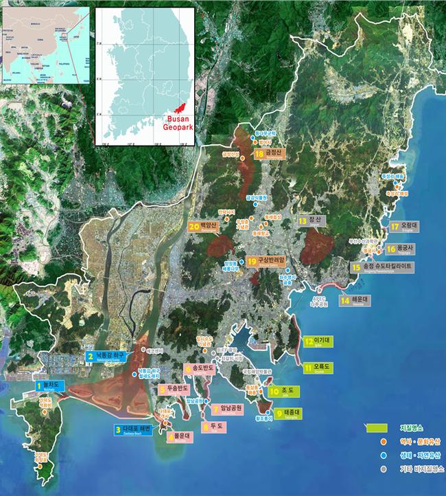 국가지질공원은 지구과학적으로 가치가 높고, 경관이 우수한 지역 가운데 `자연공원법`에 따라 환경부장관이 인증한 공원이다. 부산에는 14개 자치구에 지질명소 12곳이 있으며 면적은 296.98㎢(육상 287.99㎢, 해상 9.10㎢)에 달한다.