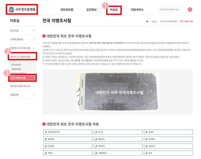 [일간환경연합 장민주 기자] 국토교통부 국토지리정보원은 지명(地名)과 지리에 대한 국민적 관심을 높이고, 학계의 관련 분야 연구를 촉진하기 위해 1959년에 작성된 대한민국 최초의 전국 지명조사철 194권을 2022년 7월 6일부터 국토정보플랫폼에 공개했다.