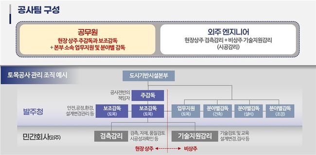 서울시가 도입하는 ‘공무원 직접감리’는 권한과 책임을 지는 감독 업무는 상주 공무원이 직접 수행하고, 기능적 검측이나 기술적인 지원 업무는 전문 엔지니어링사에서 지원받는 협업 구조로 시행된다.