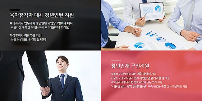 먼저, 서울시에서 인력부족으로 육아휴직이 쉽지 않았던 중소기업의 어려움을 덜기 위해 ‘육아휴직자 대체 청년인턴’의 인건비 월 236만원을 ‘해당직원 휴직 전 3개월∼휴직기간∼복귀 후 3개월’까지 최대 23개월 지원한다.