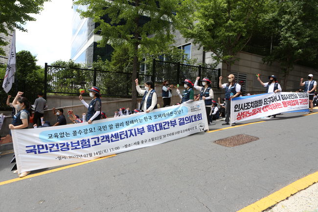 민주노총 공공운수노조 국민건강보험고객센터지부는 14일 서울시 중구 국민건강보험 고객센터 하청업체 ㈜한국코퍼레이션 앞에서 확대 간부 결의대회를 열고 한국코퍼레이션를 규탄했다.결의대회에서 건보고객센터지부는 “취업규칙을 노동자의 동의 없이 변경하고 상담노동자를 옥죄고 국민의 알권리를 훼손하는 국민건강보험 고객센터의 하청업체인 한국코퍼레이션을 규탄하기 위한 결의대회를 개최하게 됐다”고 밝혔다.