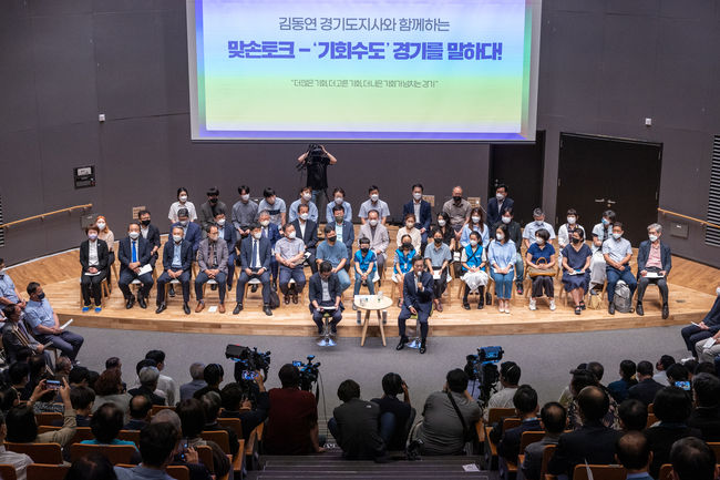 김동연 경기도지사는 15일 오전 10시 30분 도청 대강당에서 열린 ‘맞손토크-기회수도 경기를 말하다’ 행사에서 이같이 말했다. 반호영 경기도지사직인수위원회 공동위원장의 사회로 진행된 이 날 행사는 도지사가 도민과 만나 직접 소통하는 자리로 김동연 지사가 선거기간 동안 현장에서 만났던 다양한 지역민, 우수 정책제안자, 일반 도민 등 500여 명이 참석했다.