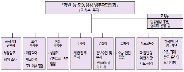 교육부는 지난 13일 이번 합동점검을 위해 공정위·복지부·여가부·국세청·경찰청·소방청 등이 참여하는 ‘학원 등 합동점검 범부처협의회’를 개최하고 관계부처 및 시도교육청 등의 협조를 구했다.