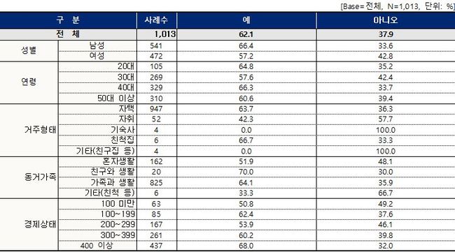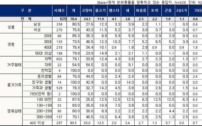 응답자 1,013명 중에 현재 반려동물을 기르고 있다고 응답한 비율은 62.1%였다. 반려동물을 기르고 있다고 응답한 사례 중 성별로는 ‘남성’ 359명(66.4%), ‘여성’ 270명(57.2%)으로 남성이 여성보다 9.2% 높게 나타났으며, 연령대는 ‘40대’ 218명(66.3%), ‘50대 이상’ 188명(60.6%), ‘30대’ 155명(57.6%), ‘20대’ 68명(64.8%)으로 40대가 가장 높은 것으로 나타났다.