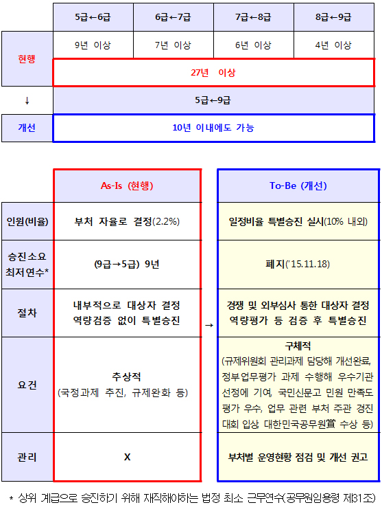 정부는 지난 1981년 특별승진제도를 도입했으나 활용 실적이 미미해 2014년 기준으로 5급 이하 공직자 가운데 우수성과자로 특별승진을 한 인원은 전체의 2.2%인 291명에 불과하다.