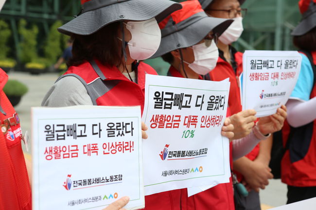 전국돌봄서비스노동조합 조합원들은 `시급 64원, 0.6%를 인상했다. 월급빼고 다 올랐다`며 생활임금 인상을 촉구했다.이들은 또 생활임금을 결정하는 생활임금 위원회에 노동자단체가 배제되어있음을 지적하며 “서울시가 생활임금 조례 5조를 지키지 않은 채 비민주적으로 생활임금을 결정하고 있다”고 지적했다.