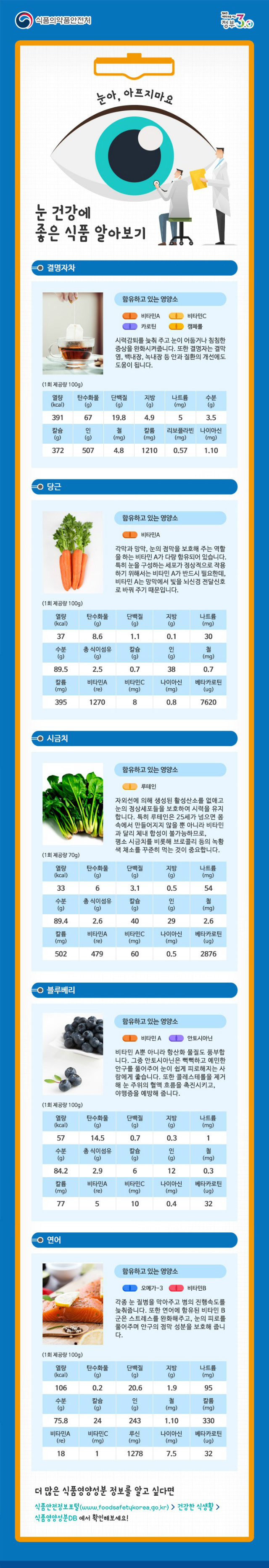 [일간환경연합 장민주 기자]다음은 눈 건강에 좋은 식품으로 식품의약품안전처가 추천한 것입니다