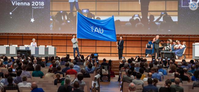 2018년 비엔나에서 개최된 제30차 IAU 총회에서 대회기를 이양받는 강혜성 교수(조직위원장)와 박명구 교수(한국천문학회장)의 모습