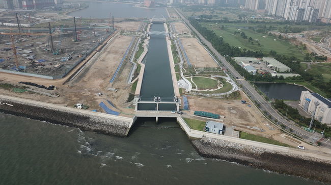 이번에 준공된 1-1단계에 이어 6공구 유수지와 아암유수지를 연결하는 1-2단계 사업은 내년 초 착공 예정이다. 길이 5.7km, 폭 400m의 남측수로를 조성하는 2단계 사업은 올해 타당성조사, 지방재정투자심사 등 사전 행정절차를 마무리하고 개발계획 변경과 기본 및 실시설계용역을 동시에 추진해 오는 2025년 착공해 2027년 준공할 계획이다.