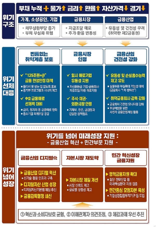 고물가와 경기부진 우려 등의 복합요인으로 변동성이 확대되고 있는 금융시장은 선제적으로 대응키로 했다. 가계와 기업 등 실물부문의 부실이 금융부문으로 전이되지 않도록 하기 위해서다.