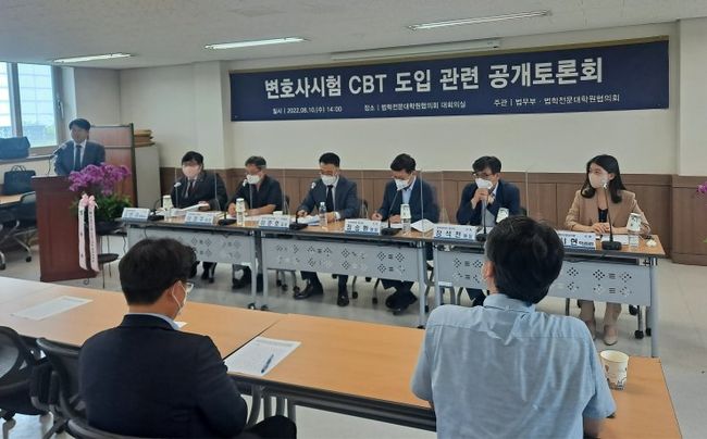 법무부는 오늘 오후 2시 법학전문대학원협의회 대회의실에서 「변호사시험 CBT 도입 대국민 공개토론회」를 개최했다고 밝혔다. 참석자들이 변호사시험 컴퓨터 답안작성 방식(CBT)에 대해 토론하고 있다.