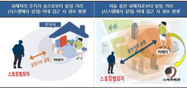 스토킹범죄자가 피해자 주변에 접근할 경우 위치추적관제시스템을 통한 실시간 경보 발생, 보호관찰관의 신속한 개입으로 재범 방지