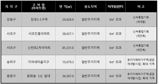 송파구 거여새마을지구와 중랑구 중화동 122일대의 경우, 정비구역 정형화 등 구역 변경에 따라, 지난 4월 4일 지정한 허가구역 지정범위를 확대하는 것으로, 기존 토지거래허가구역과 지정기간을 일치되도록 하였다.