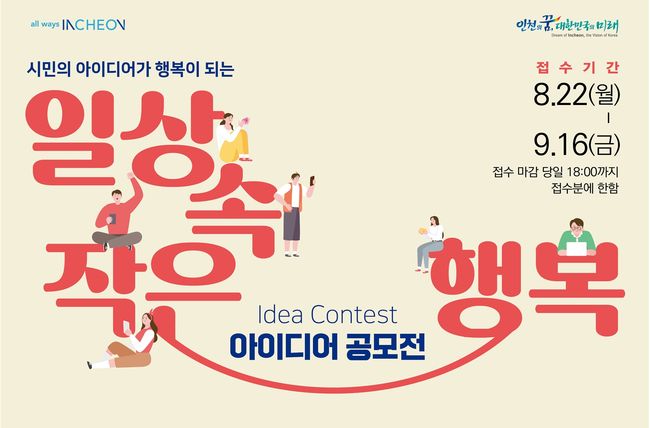 인천광역시는 시민의 목소리를 담아내는 「일상 속 작은 행복 아이디어 공모전」을 내달 16일까지 실시한다고 밝혔다.