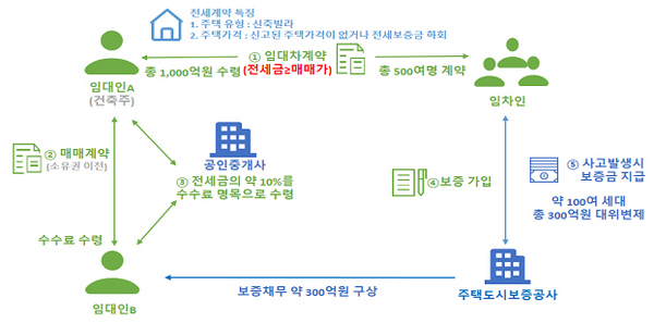 ▲ 명의이전을 통한 보증 돌려막기 전세사기 의심사례.구체적인 사례를 살펴보면, 임대인 A씨는 공인중개사와 공모해 500여명을 대상으로 총 1000억원 가량의 깡통전세 임대차 계약을 체결한 뒤 다른 임대인에게 주택을 매도하고 잠적해 수사 대상이 됐다.