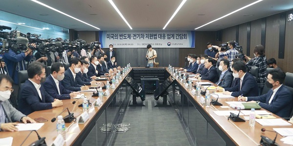 산업통상자원부는 이창양 장관 주재로 25일 서울 대한상공회의소 회의실에서 ‘반도체·자동차·배터리 업계 간담회’를 열고 미국의 최근 입법 동향과 관련해 대응 방안을 논의했다고 밝혔다.
