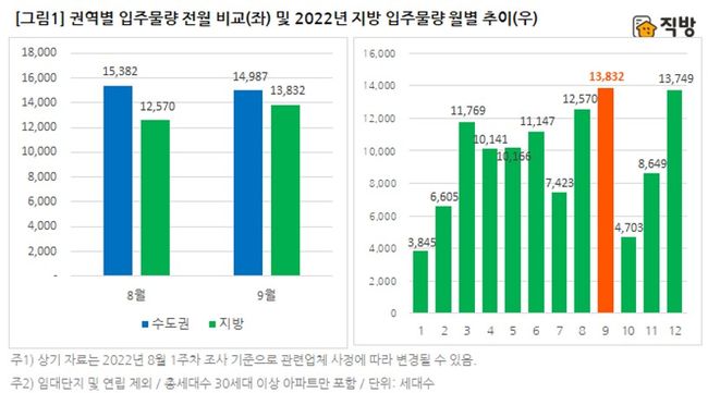 권역별 입주물량 전월 비교(왼쪽) 및 2022년 지방 입주물량 월별 추이(오른쪽) (이미지=직방 제공)