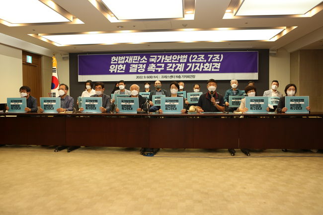 국가보안법폐지 국민행동은 6일 서울 중구 프레스센터에서 `헌법재판소 국가보안법 위헌 결정 촉구 각계 기자회견`을 열었다.오는 15일에 진행될 헌재의 국가보안법 헌법소원·위헌법률심판제청 공개 변론을 앞두고 국민행동은 "국가보안법은 일제 식민통치의 유산"이라며 헌재의 위헌 결정을 촉구했다.