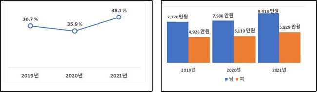 상장법인 전체 성별 임금격차(좌), 상장법인 성별 임금 현황(우)