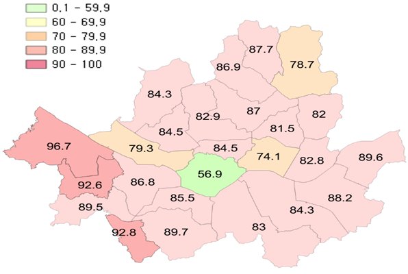 `22.8월 기준 자치구별 연립다세대 2분기 신규 계약 전세가율 현황 (단위: %, 출처: 서울시 전월세 정보몽땅)