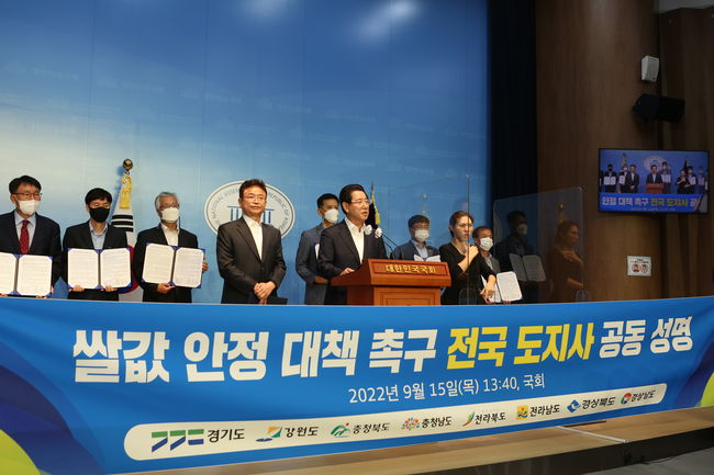 경기 · 강원 · 충북 · 충남 · 전북 · 전남 · 경북 · 경남 등 8개 지역 도지사들은 15일 국회 소통관에서 `쌀값 안정 대책 촉구` 공동성명 발표 기자회견을 가졌다.이들은 기자회견에서 "생산비 상승과 쌀값 폭락으로 농민이 이중고를 떠안고 있다"며 "정부는 즉각 쌀값 안정 대책을 마련하라"고 촉구했다.