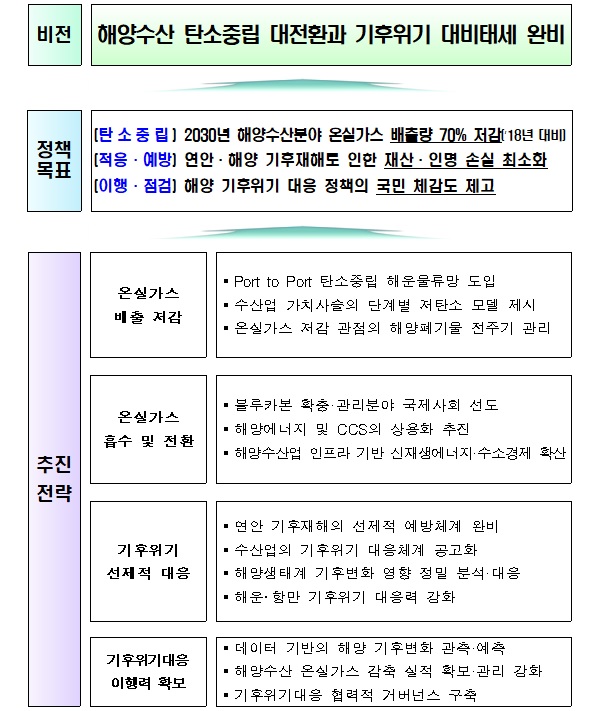 해수부는 ▲2030년 해양수산 분야 온실가스 배출량 70%저감(2018년 대비) ▲연안·해양 기후재해로 인한 인명·재산 손실 최소화 ▲해양 기후위기 대응 정책의 국민 체감도 제고 등을 정책 목표로 삼았다.