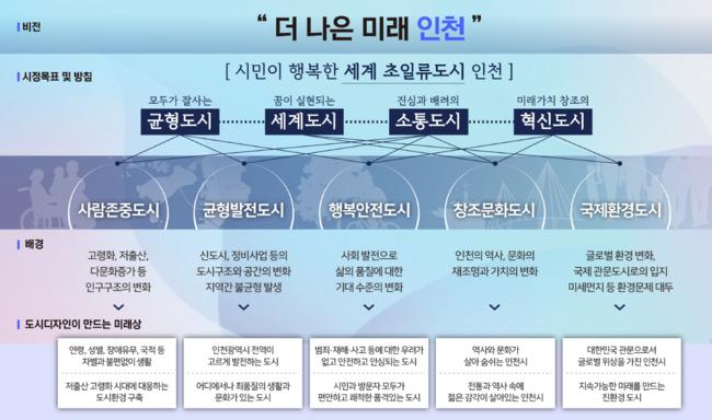 특히 도시디자인 정책으로 인천시의 사회적 변화와 문제에 대응하기 위한 ‘더 나은 미래 인천’ 비전과 5개 추진 전략을 도출했다. 5개 추진전략은 ▲사람존중도시 ▲균형발전도시 ▲행복안전도시 ▲창조문화도시 ▲국제환경도시다.