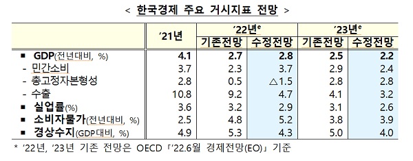 19일 기획재정부에 따르면 OECD는 이날 발표한 2022년 한국경제 보고서에서 올해 한국의 경제성장률 전망치를 종전 2.7%에서 2.8%로 0.1%p 상향 조정했다.