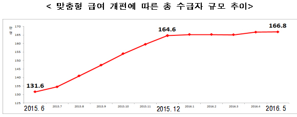 보건복지부는 4일 ‘기초생활보장 맞춤형 급여 개편 전·후 비교’ 자료를 통해 맞춤형 기초생활보장 수급자 수가 2016년 5월 기준 167만명으로 개편 전에 비해 35만명(27%) 증가했다고 밝혔다.